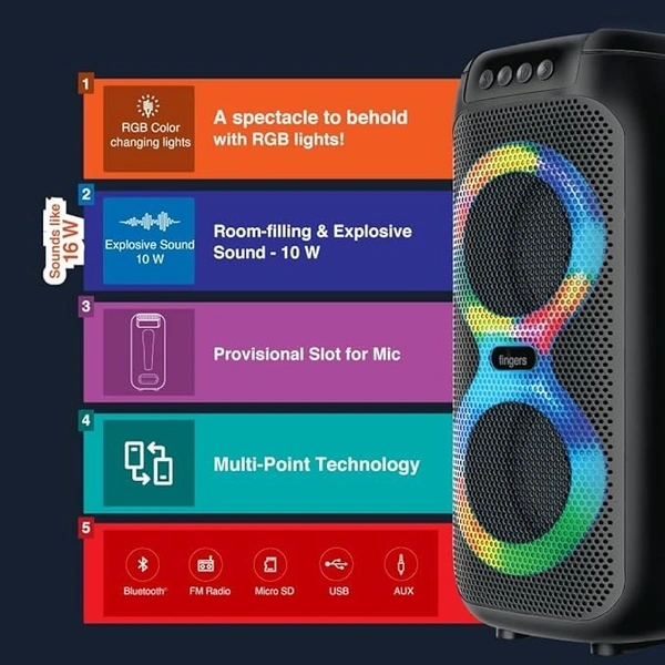 FINGERS Swag5 Bluetooth Portable Speaker (with RGB lights, 10 W Deep Bass, FM, USB, MicroSD, AUX, Mic in (6.35 mm), Multi-point Technology, Provisional Slot for Wired/Wireless Mic)